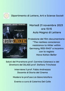 Si avvisano gli studenti che, in occasione dell'incontro con la regista Hava Kohav Beller e della proiezione del film documentario sul nazismo dal titolo “The restless conscience”, la lezione prevista per martedì 21 novembre inizierà alle ore 13:15 in Aula Magna di Lettere.