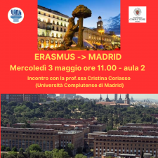 Si avvisano gli studenti che mercoledì 3 maggio alle ore 11:00 in aula 2 avrà luogo un incontro inerente l’erasmus con l’Università Complutense di Madride che vedrà la partecipazione della prof.ssa Cristina Coriasso.