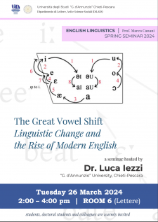 "The Great Vowel Shift: Linguistic Change and the Rise of Modern English" - Seminario ENGLISH LINGUISTICS - mar 26/03/24 ore 14:00