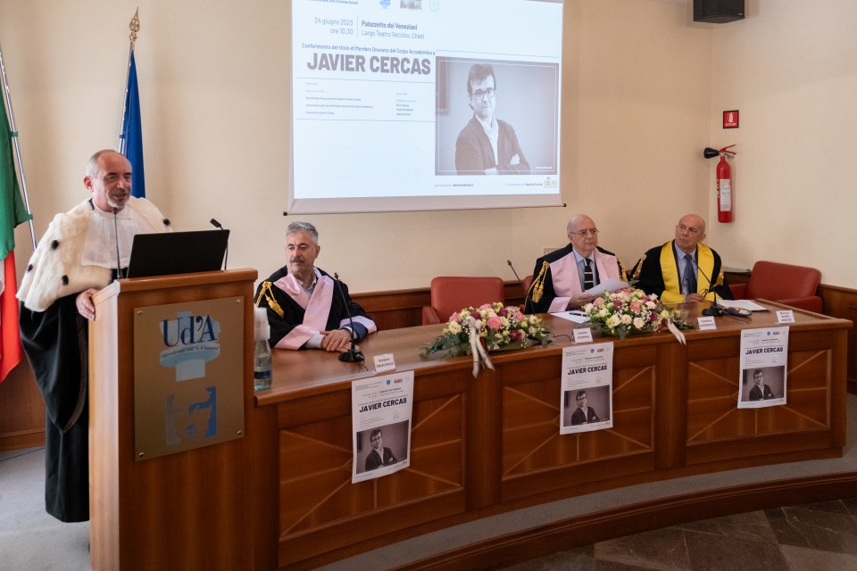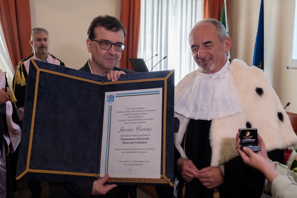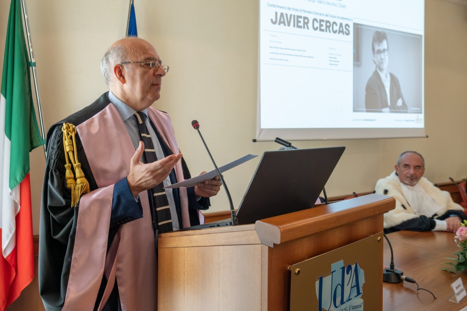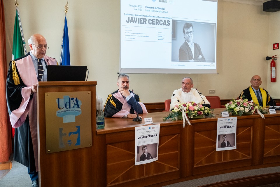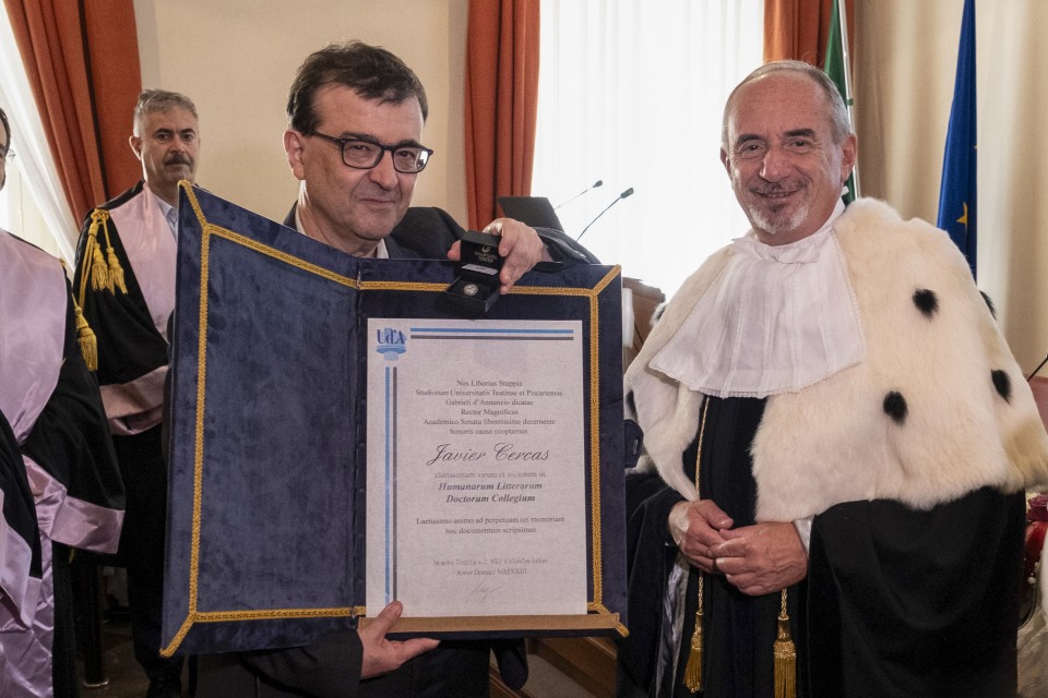 Il Magnifico Rettore, Liborio Stuppia, ha conferito al professor Javier Cercas il titolo di Membro onorario del Corpo accademico dell’Università degli Studi “Gabriele d’Annunzio” di Chieti-Pescara.