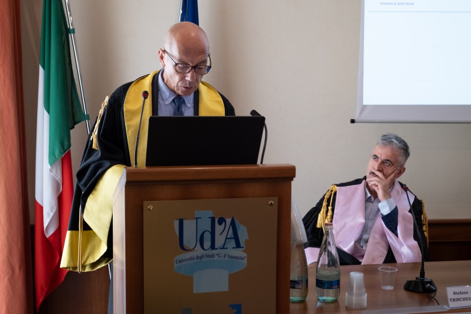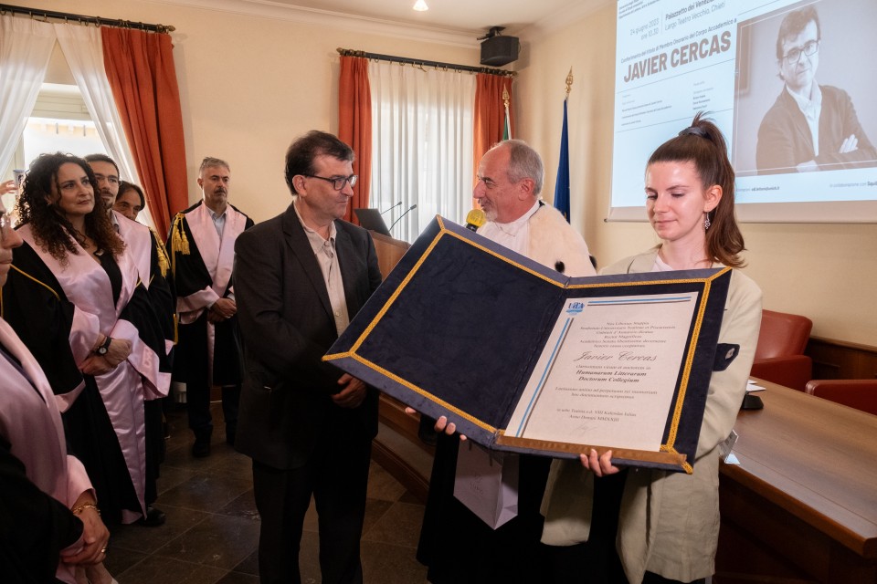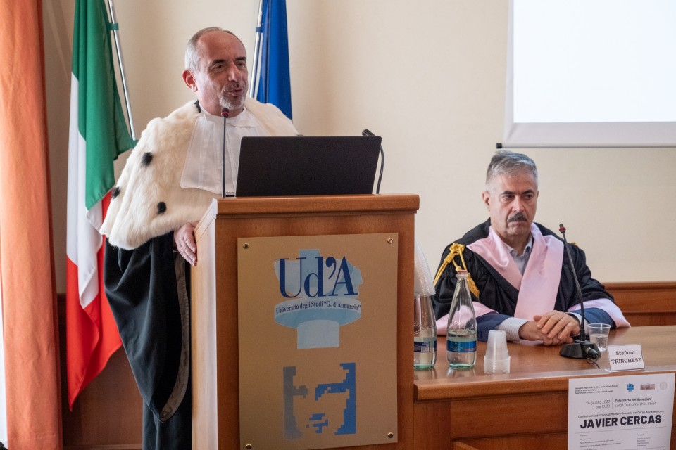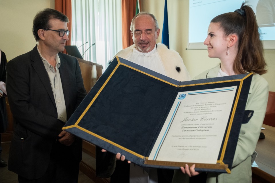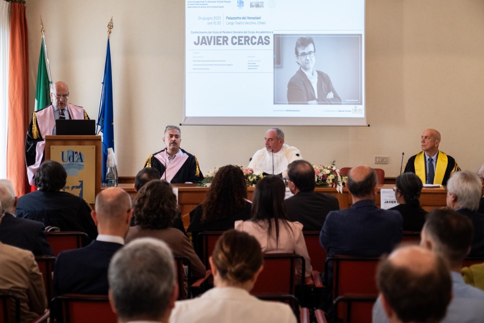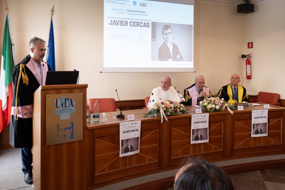 Il Magnifico Rettore, Liborio Stuppia, ha conferito al professor Javier Cercas il titolo di Membro onorario del Corpo accademico dell’Università degli Studi “Gabriele d’Annunzio” di Chieti-Pescara.