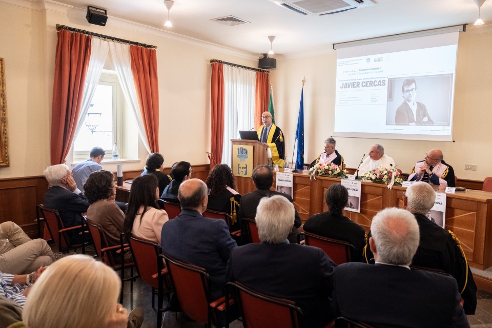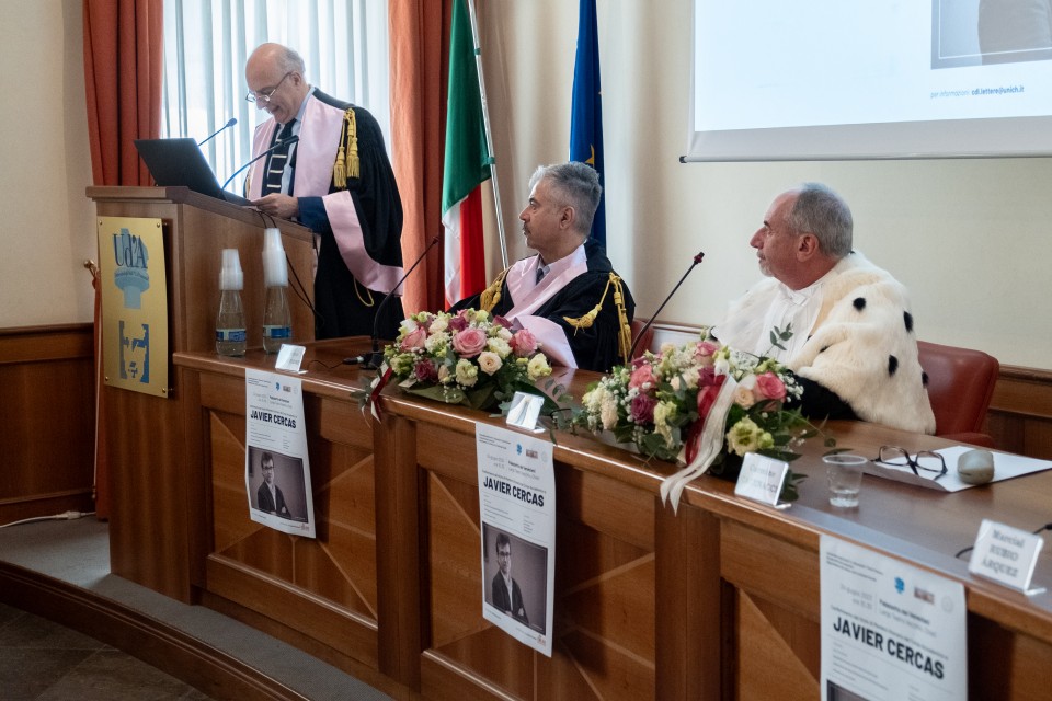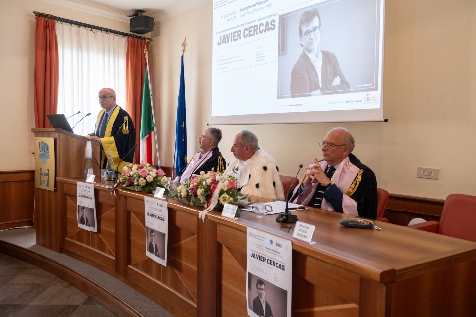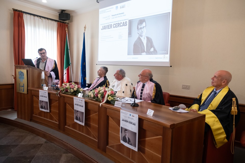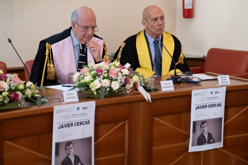 La solenne cerimonia è stata aperta dai saluti istituzionali del prof. Carmine Catenacci, Direttore del Dipartimento di Lettere, Arti e Scienze Sociali, del Rettore, prof. Liborio Stuppia, e del prof. Stefano Trinchese, Presidente della Scuola di Studi umanistici. Il professor Marcial Rubio Árquez, docente di Letteratura spagnola presso il Dipartimento di Lingue, Letterature e Culture moderne, ha poi presentato l’opera di Javier Cercas.