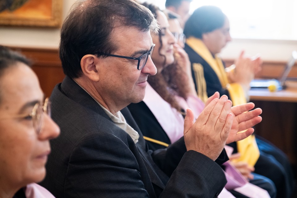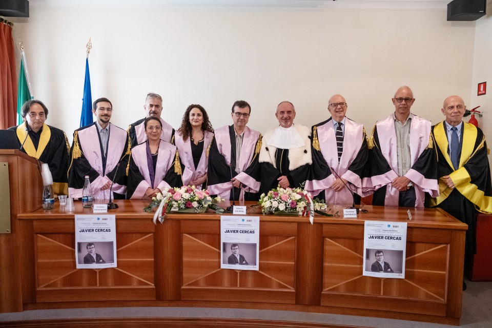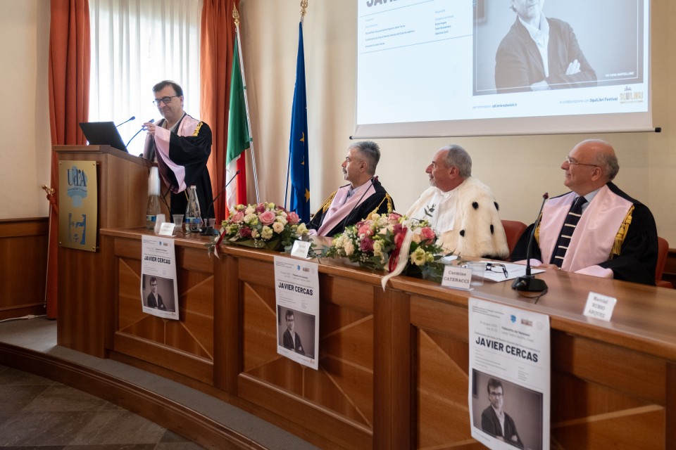 Dopo aver ricevuto l’onorificenza dalle mani del Rettore, il professor Javier Cercas ha rivolto alle autorità accademiche il suo saluto di ringraziamento, sottolineando quanto sia stato grande e commovente l’onore di aver ricevuto per la prima volta in Italia un così importante riconoscimento accademico.